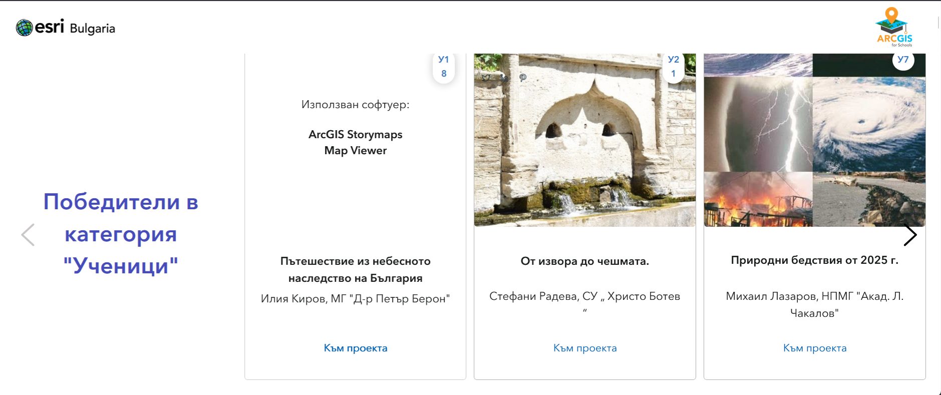Разработката, създадена чрез софтуера ArcGIS Storymaps, му носи първо място и в категория „Ученици“. Второто място с проекта „От извора до чешмата“ печели Стефани Радева (СУ „Христо Ботев“, Русе). Трети е класиран Михаил Лазаров от НПМГ „Акад. Л. Чакалов“ с проекта „Природни бедствия от 2025 г.“.