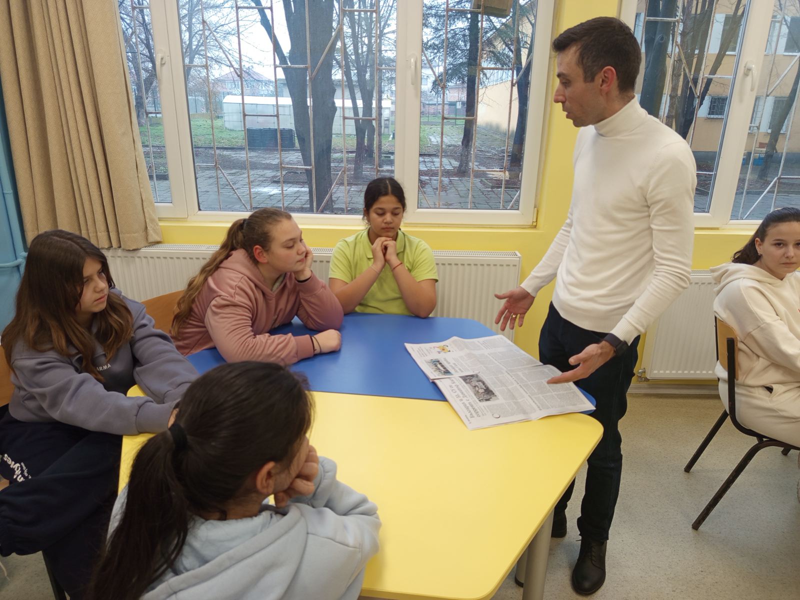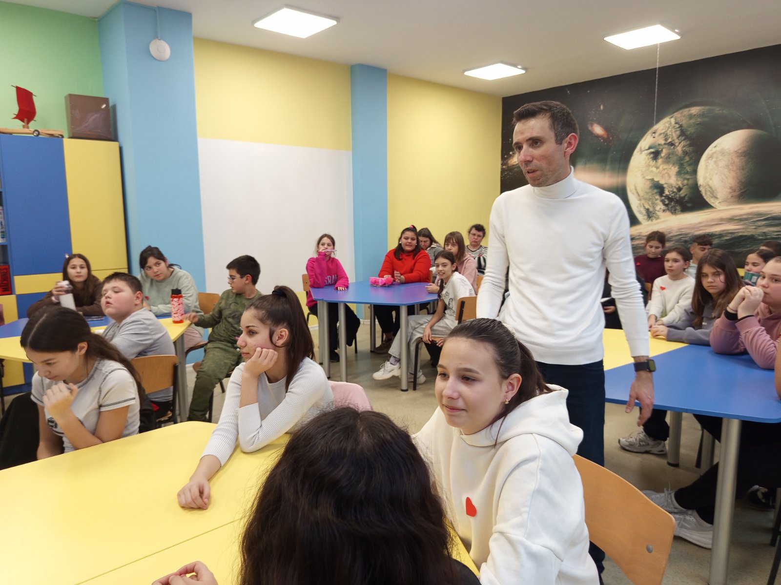 Тема на заниманията бе и как работят алгоритмите на TikTok, Instagram и YouTube, както и монетизирането на клипове в социалните мрежи. Учениците активно споделяха примери по дискутираните въпроси. Заниманието приключи с творческа задача, като участниците в открития урок бяха разделени на групи.