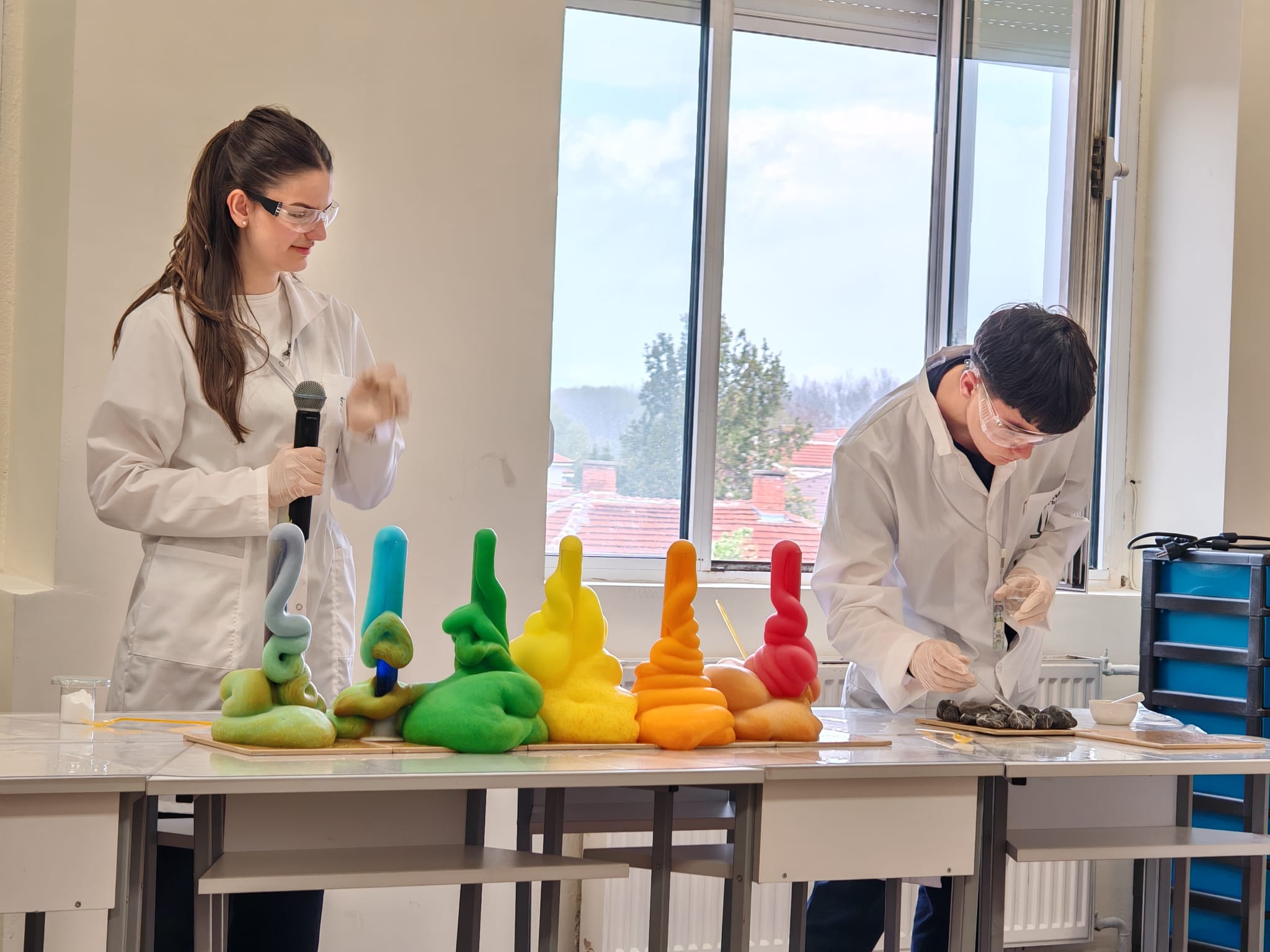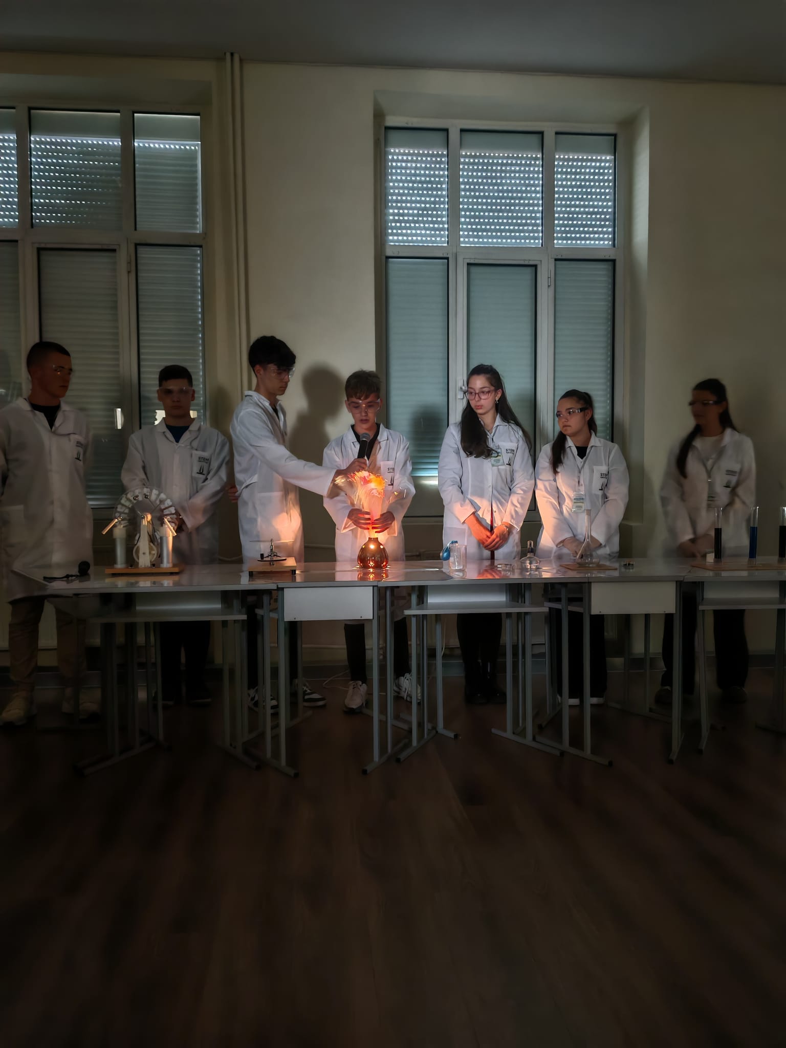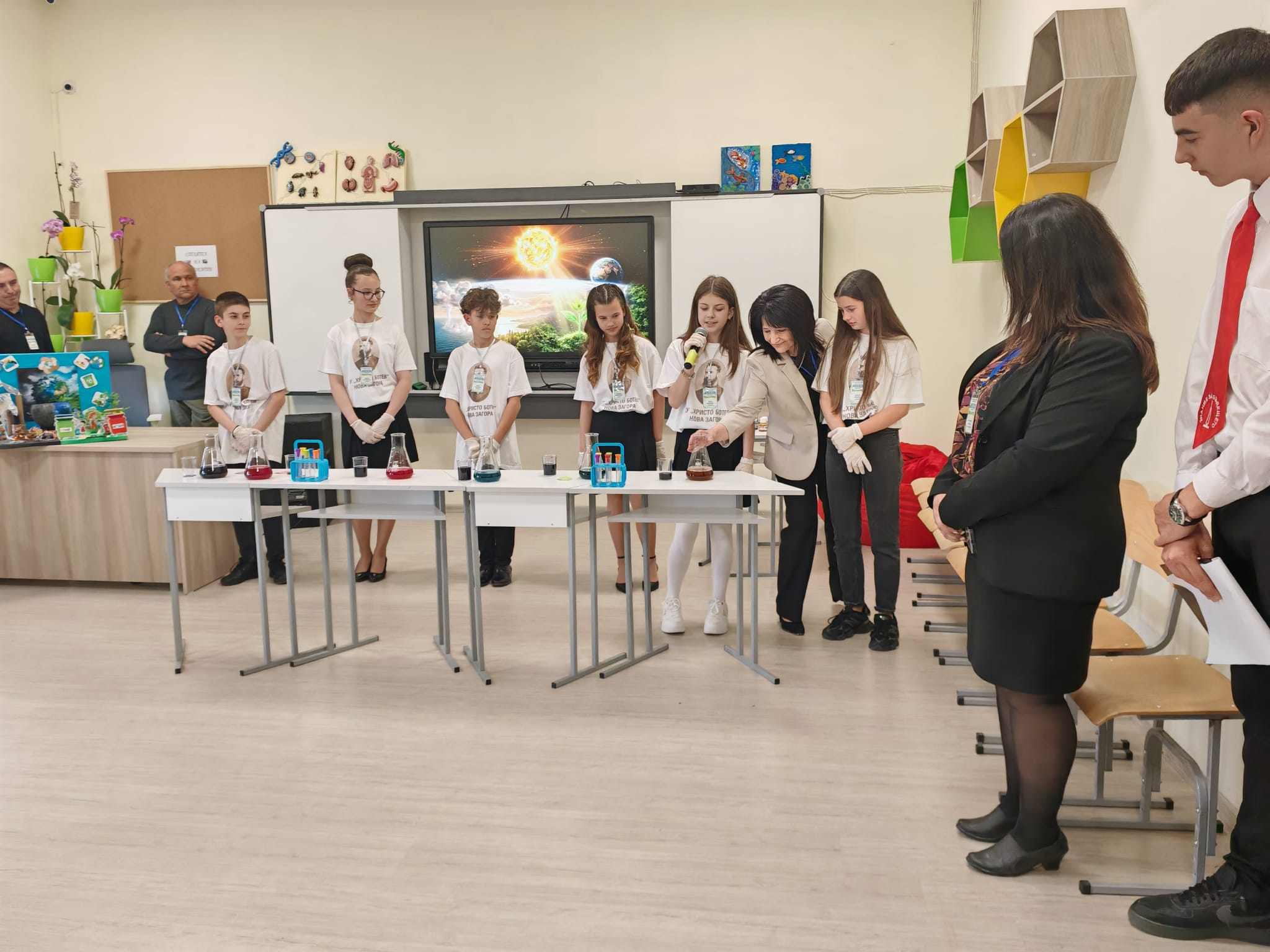В кабинета по химия учениците представиха експерименти, с които показаха как невидимите частици изграждат света около нас. В класната стая по биология заедно със своите преподаватели те разкриха чрез практически демонстрации и как от материята възниква животът.