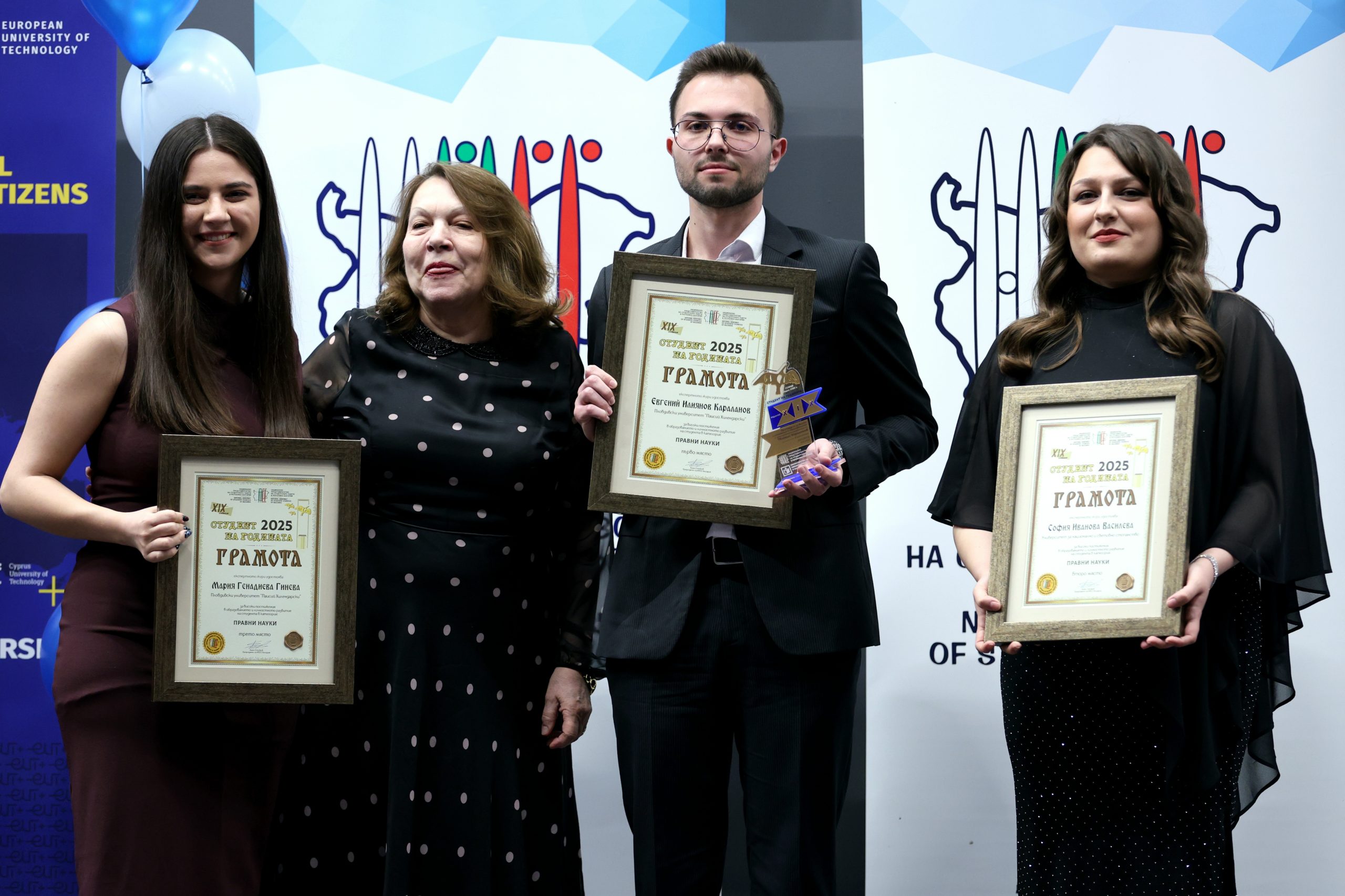София (27 март 2026) В зала „Тех Арена“ на Техническия университет – София, Националното представителство на студентските съвети (НПСС) отличава на официална церемония най-успешните и активни студенти на България в поредното издание на Националния приз „Студент на годината“. На снимката: Наградата в категорията „Правни науки“ се връчва на Евгений Илиянов Караланов от Пловдивския университет „Паисий Хилендарски“ от главния редактор на двуезичното списание „Правен преглед“ проф. Мария Славова. Снимка: Благой Кирилов/БТА (ПБ)