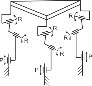 Unlike the hexapods (e.g. Stewart Platforms) and delta robots where the moving armes (legs) are six, there are many constructions using three movable arms to obtain spatial motion. These mechanisms are not so complex as hexapods and they find applications in various industry like biomedicine, machine tools, positioning systems, etc.