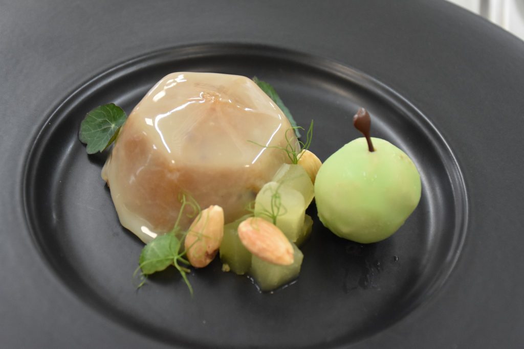 С помощта на бивши ученици на гимназията и настоящи студенти в Института по кулинарни изкуства шеф Колев показва модерен прочит на десерт от българската национална кухня. Учениците от XII клас приготвят грис халва с бадеми, карамелен център и огледална глазура с вариация от ябълки.