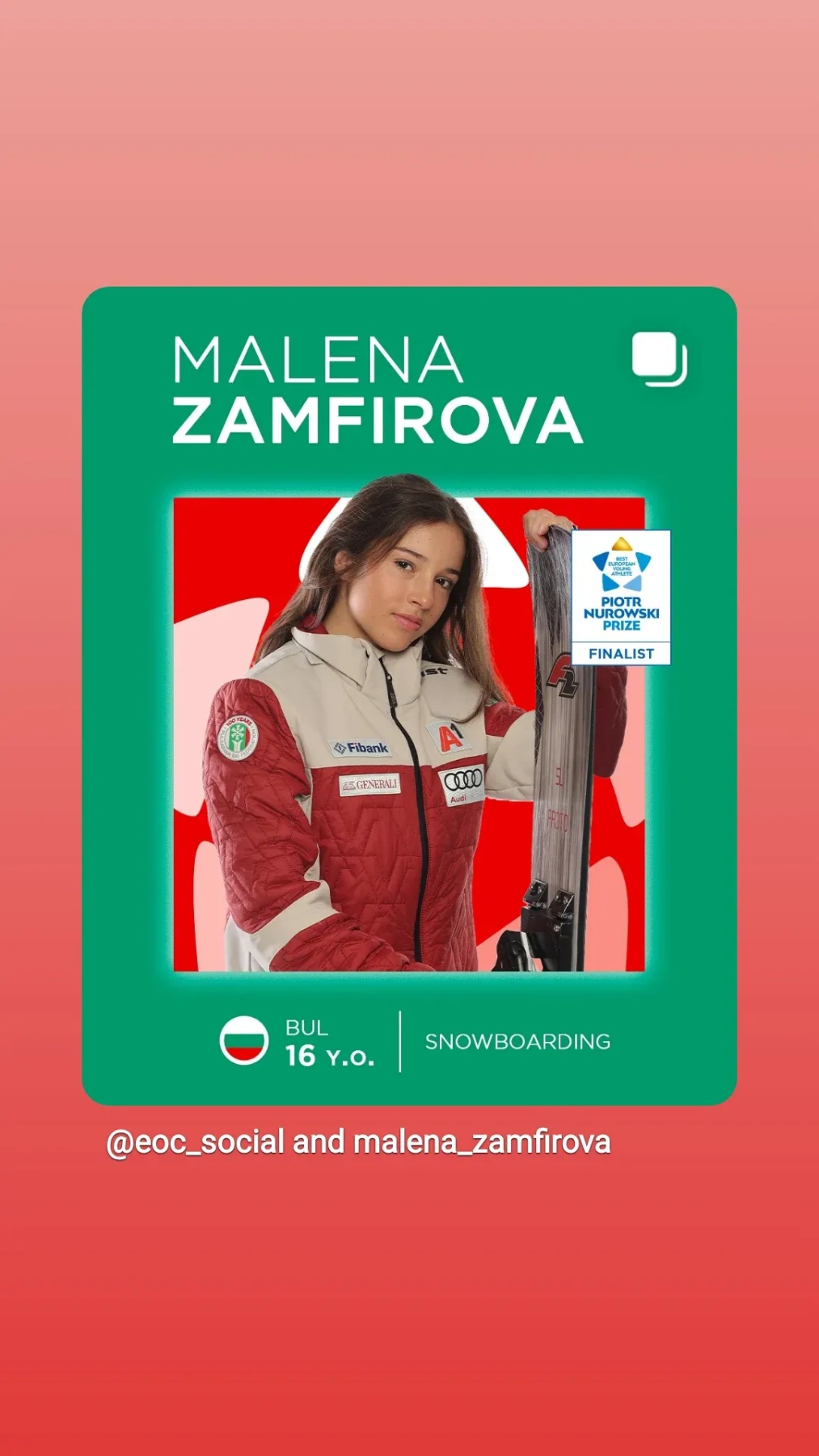 Българската сноубордистка Малена Замфирова триумфира в 10-ото зимно издание на наградата „Пьотр Нуровски“ за най-добрия млад спортист на Европейските олимпийски комитети (ЕОК). Тя бе сред петте номинирани за отличието, като спечели след гласуване на представителите на всички национални олимпийски комитети на Стария континент по време на 45-ия семинар на ЕОК в Малта.