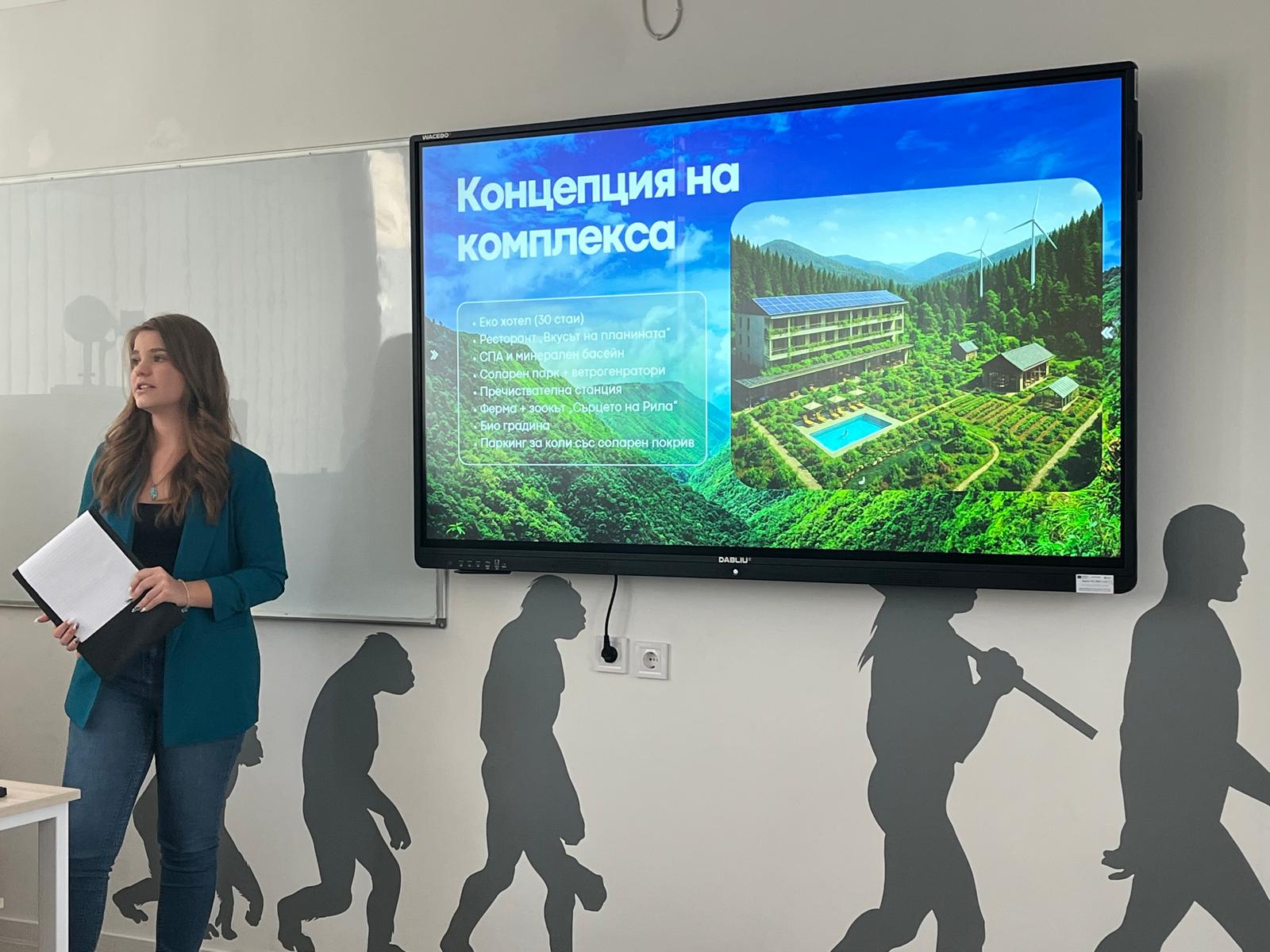 Разделени на екипи, те изследваха и решаваха какво отопление да има, за да не се замърсява природата, проектираха поставяне на соларни панели и ветрогенератори, изграждане на пречиствателна станция, създаване био ферма, паркинг, басейн и др.