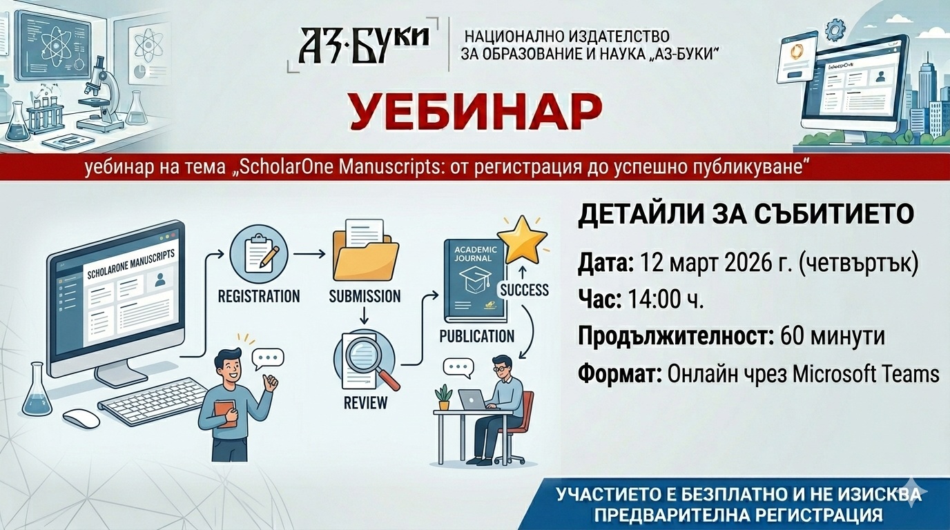 Уебинарът ще бъде особено полезен за автори, които публикуват в научните списания на „Аз-буки“, както и за всички, които работят в среда на анонимно рецензиране и следват международни стандарти за научна комуникация.